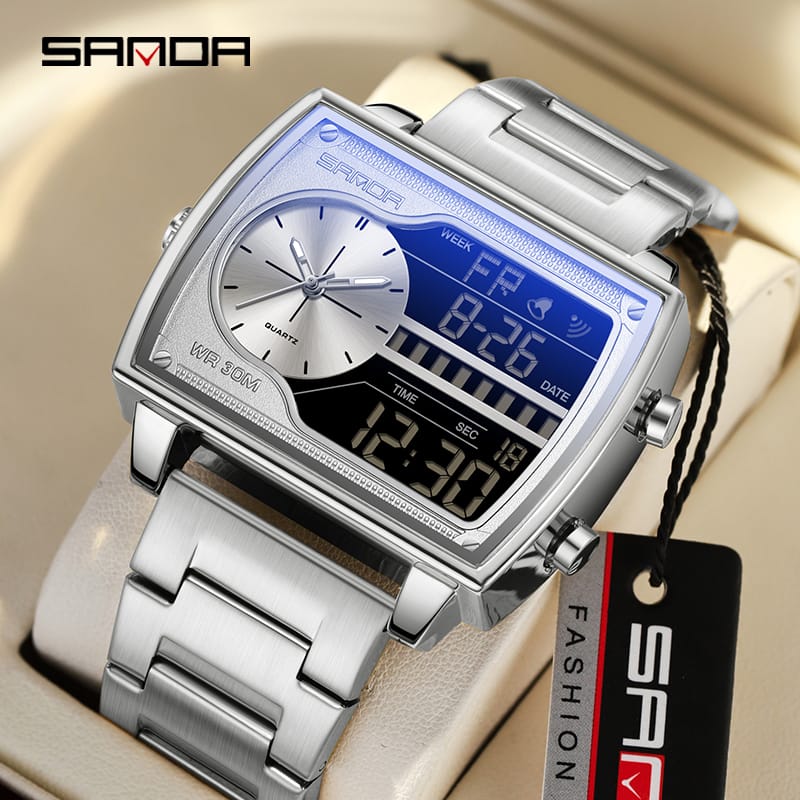 Experience the perfect mix of style and function with SAMDA’s analog-digital watches. Featuring a sleek rectangular dial, stainless steel strap, water resistance, and multifunctional features – these timepieces are built to elevate your everyday look.