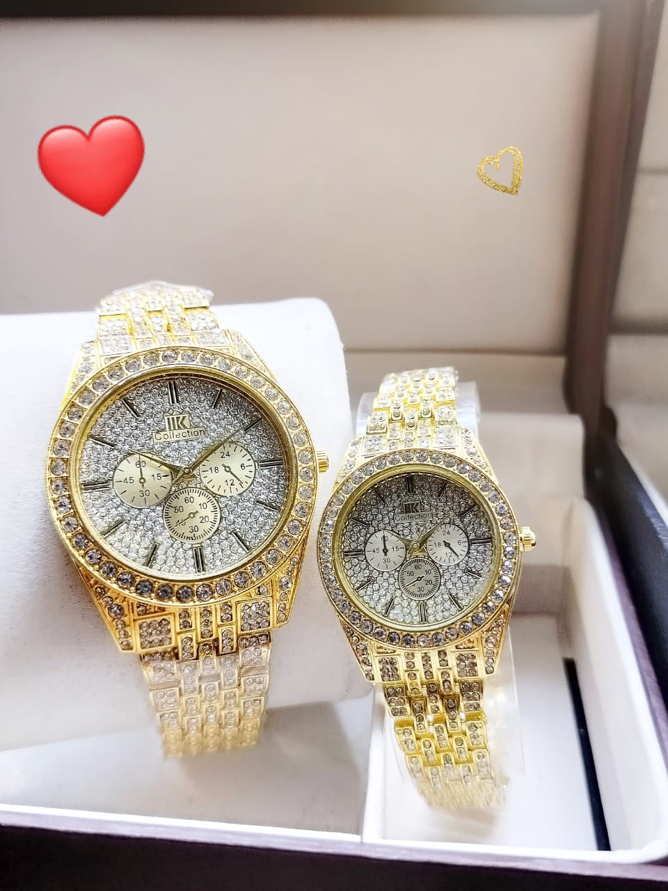 Elevate your style together with this Luxury Gold Diamond Couple Watch Set. Designed for modern couples who love elegance and class, these watches feature shimmering crystal accents, a premium metallic finish, and durable stainless-steel straps. Perfect for weddings, anniversaries, or gifts — these timepieces add a touch of royalty to every moment.